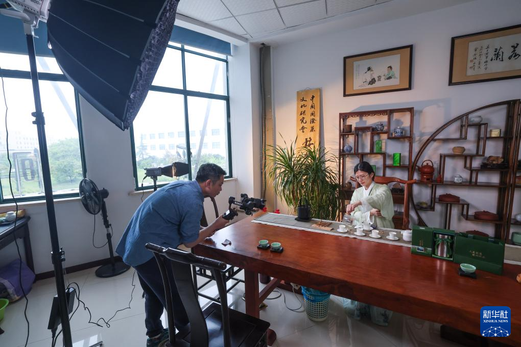 4月7日,工作人员在直播展示婺州举岩茶的冲泡茶艺。