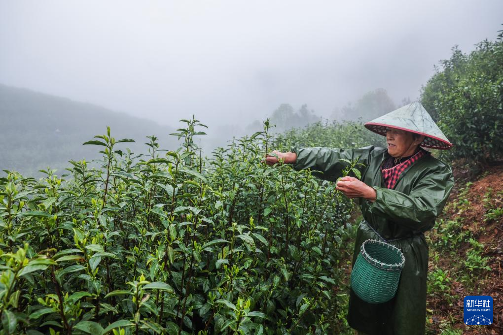 4月7日,在浙江金华的金华山鹿田村的婺州举岩茶基地,茶农采摘举岩茶鲜叶。