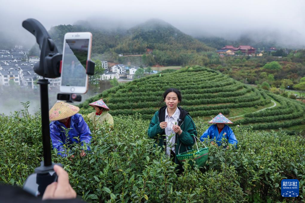 4月7日,在浙江金华的金华山鹿田村的婺州举岩茶基地,工作人员直播介绍婺州举岩茶。