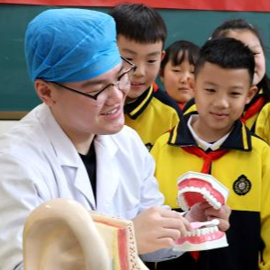 4月7日,在山东省枣庄市东湖小学,医务人员向学生们讲解保护牙齿的方法。