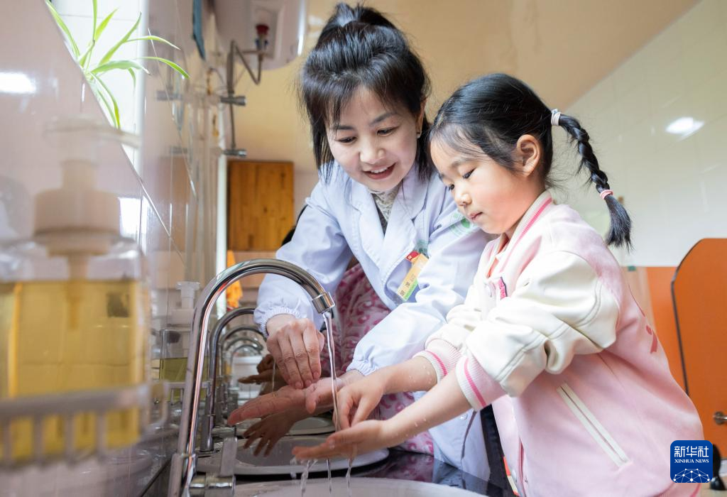 4月7日,在浙江省湖州市吴兴区朝阳街道红丰社区红丰幼儿园,小朋友在医生指导下学习“七步洗手法”。