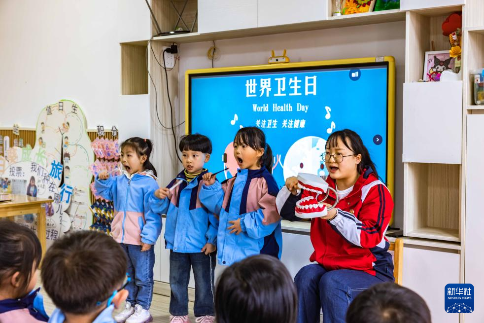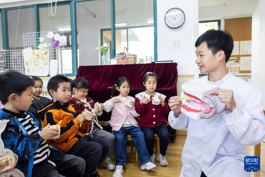4月7日,在浙江省湖州市吴兴区朝阳街道红丰社区红丰幼儿园,医生向小朋友们讲解正确的刷牙方式。