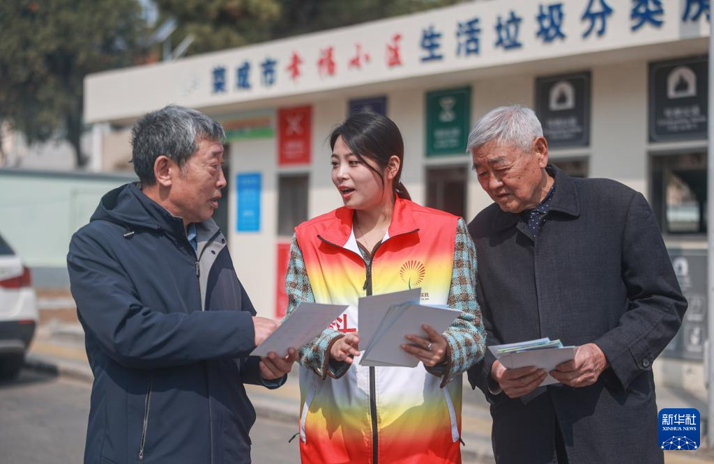 4月7日,在山东省荣成市河东社区,社区志愿者向居民宣传垃圾分类知识。