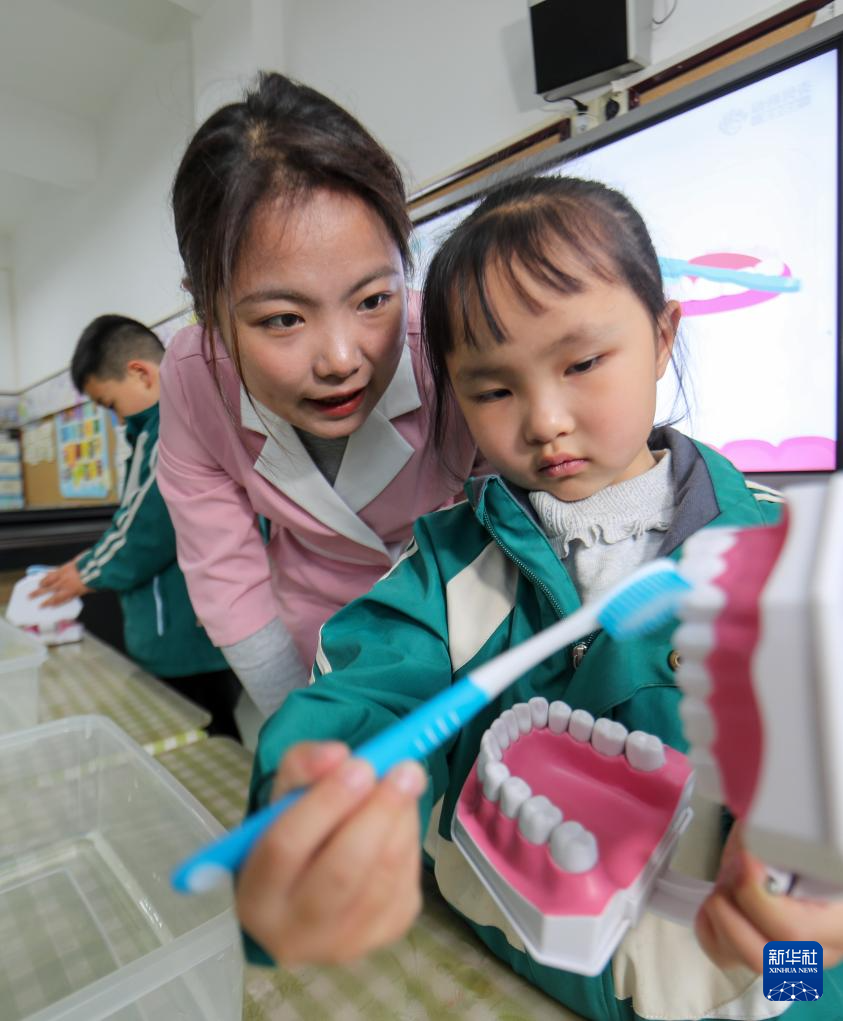 4月7日,在贵州省安顺市西秀区第三幼儿园,小朋友在老师的指导下学习正确的刷牙方式。