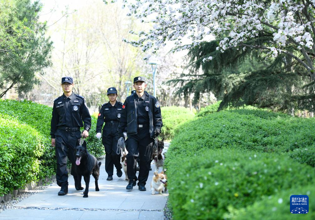 4月7日,“福仔”观看战友“小黑”的扑咬训练。