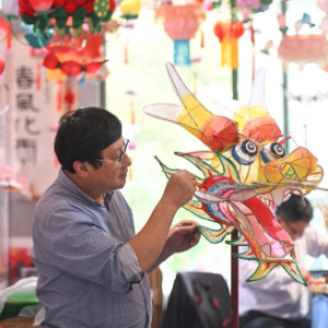 在小西湖街区的工作室,秦淮灯彩艺人、国家级非物质文化遗产代表性传承人顾业亮在龙灯上彩绘(4月1日摄)。