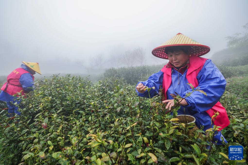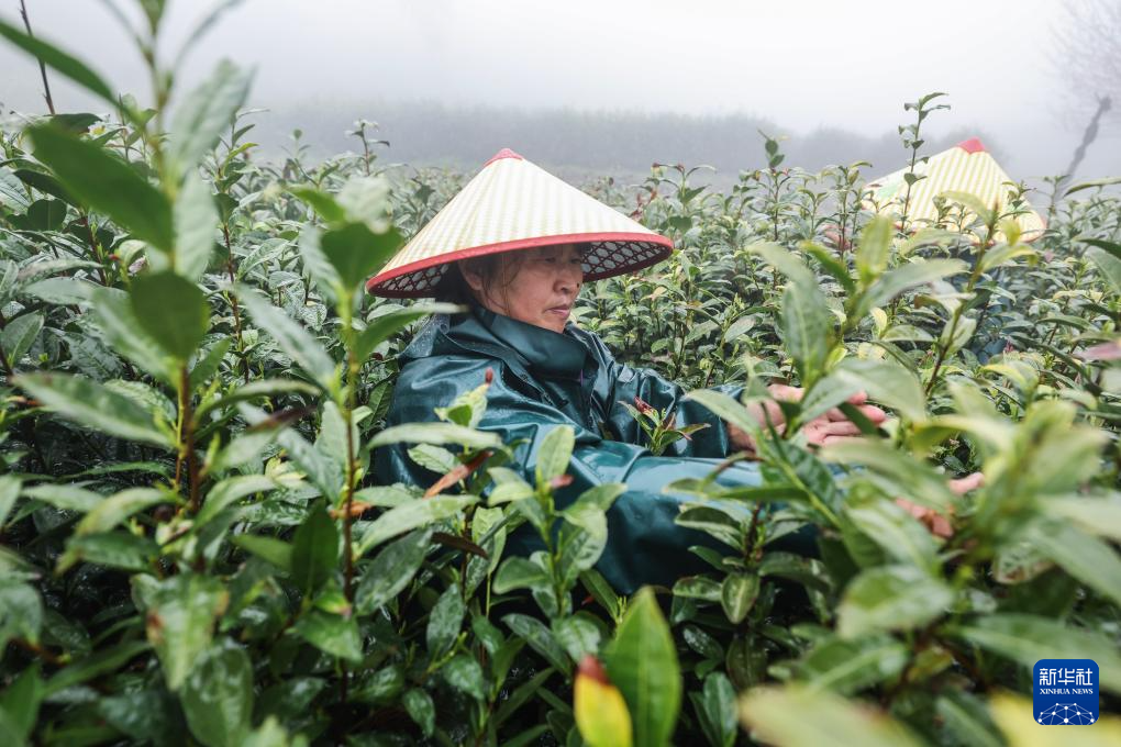 4月8日,在里山镇安顶村的安顶云雾茶种植基地,茶农在采摘云雾茶。