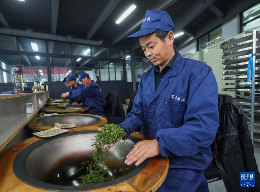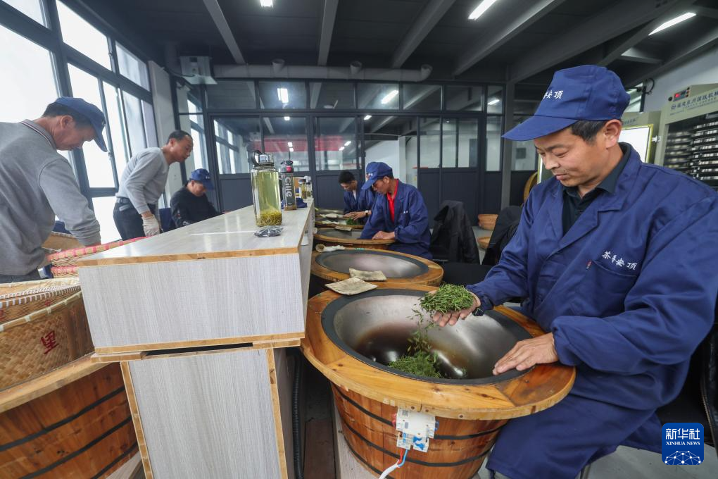 4月8日,在里山镇安顶村共富工坊内,茶农在手工炒制安顶云雾茶。