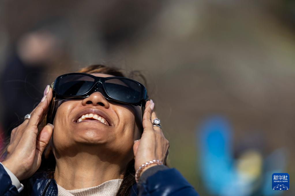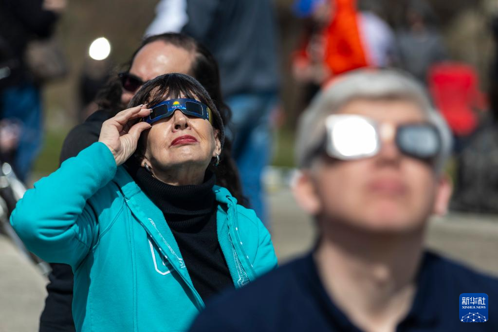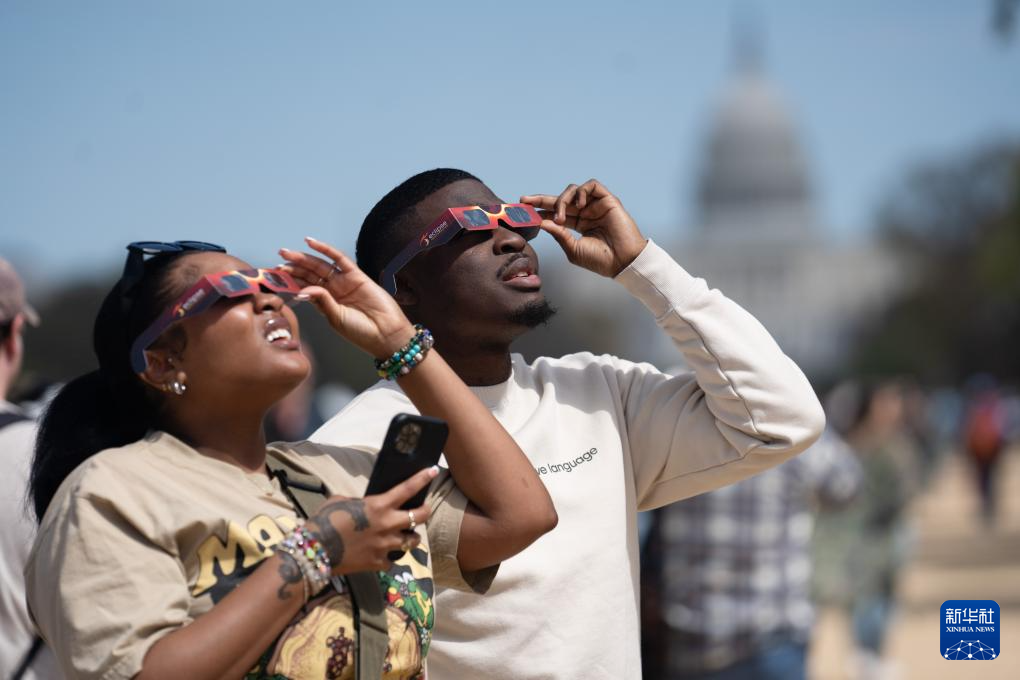4月8日,人们在美国首都华盛顿的国家广场草坪上观看日食。