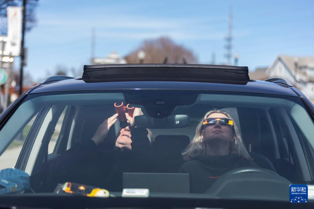 4月8日,在美国纽约州普拉茨堡,人们坐在车内观看日食。