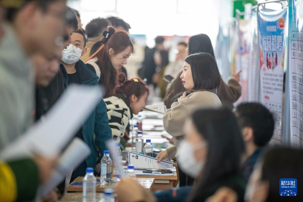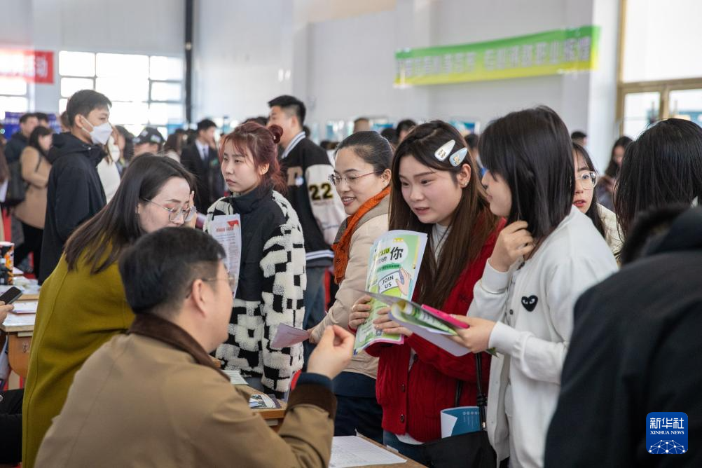 4月9日,求职者在联合招聘会现场与招聘方代表沟通交流。