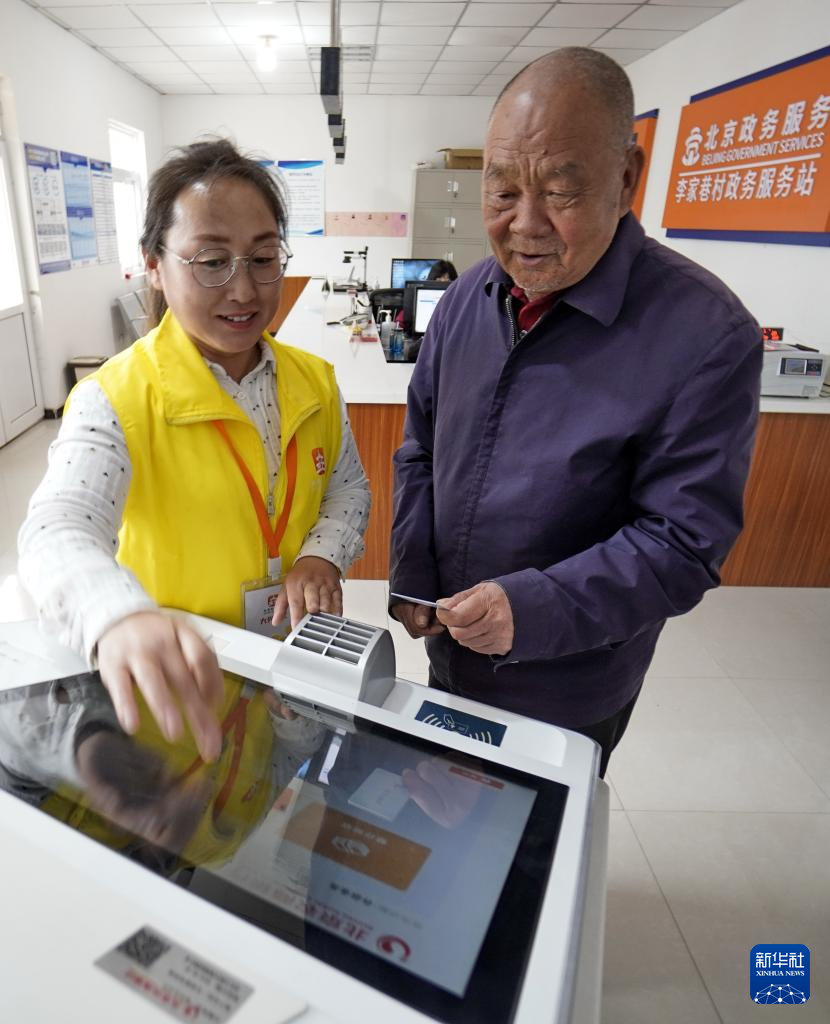 大兴区庞各庄镇李家巷村政务服务站的工作人员帮助一名瓜农办理农业补贴领取业务(4月9日摄)。