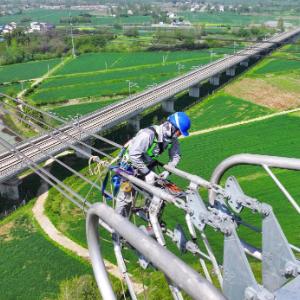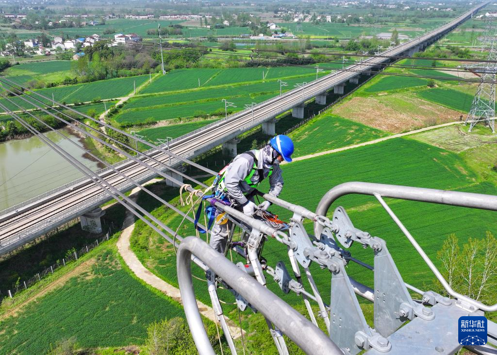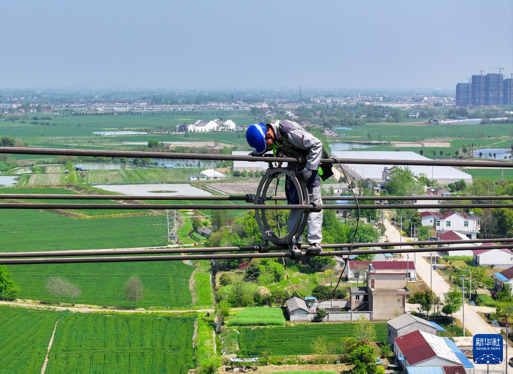 4月9日,在位于安徽省合肥市庐江县郭河镇的直流±800千伏建苏线3418号杆塔处,国网合肥供电公司工人进行高空检修作业(无人机照片)。