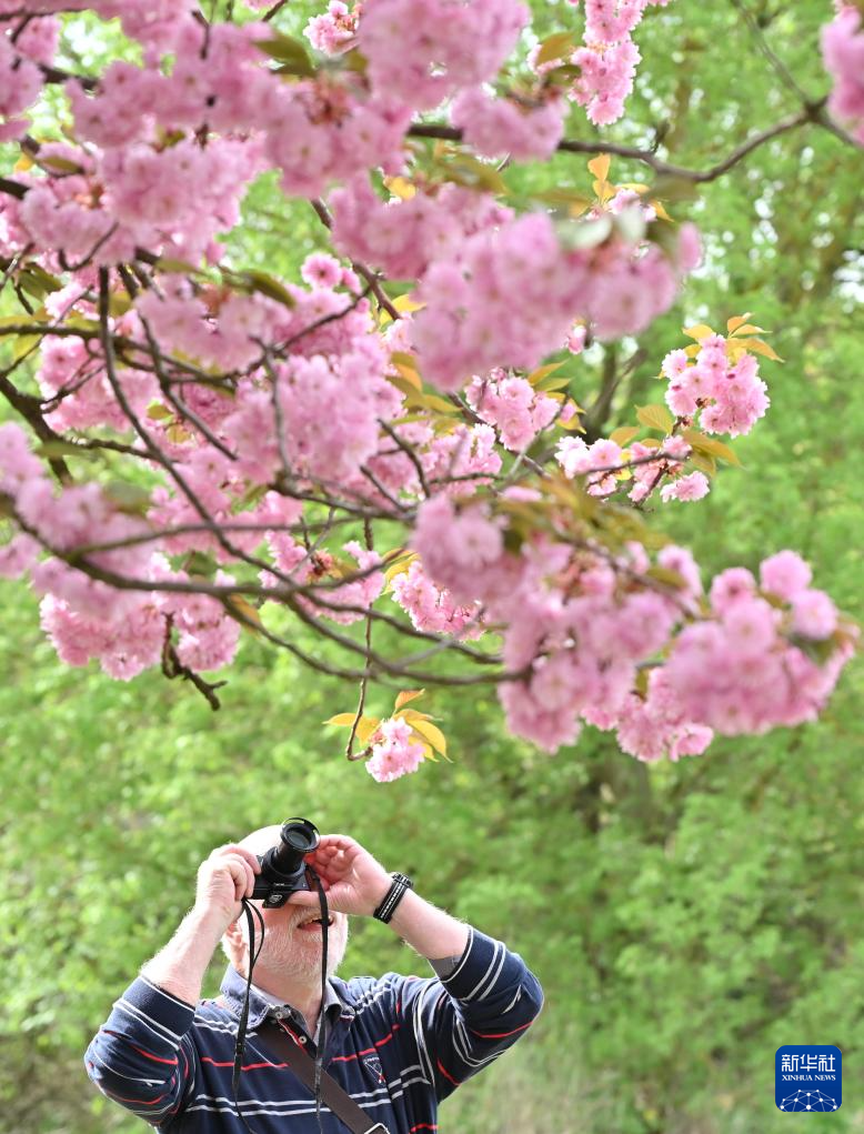 4月9日,在德国柏林,一名男子拍摄盛开的樱花。