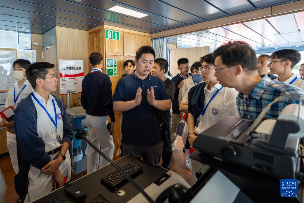 4月10日,中国第40次南极考察队员裴佳豪在为参观者讲解月池车间和大洋考察作业情况。