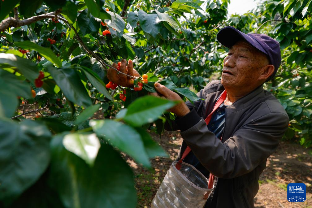4月9日,在米易县普威镇独树村,村民孙登武在采摘樱桃。该村种有3800多亩樱桃,仅樱桃就能使村民人均年增收6000余元。