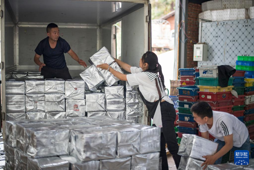 4月9日,工人在米易县普威林产品分拣中心将包装好的樱桃装车。