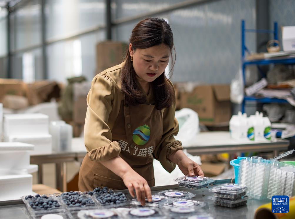 4月9日,蓝莓种植户付利在米易县普威镇一个蓝莓种植基地内分拣、包装蓝莓。