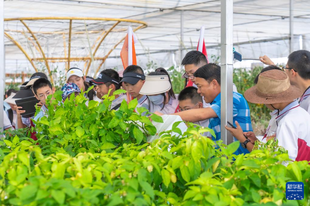4月7日,在米易县丙谷镇共富农场,农场负责人冷开华(右三)为参与研学的学生们介绍无土栽培技术。