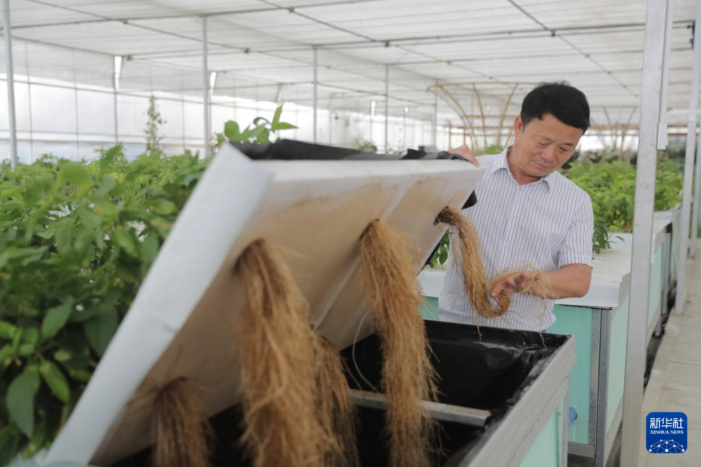 4月8日,在米易县丙谷镇共富农场,农场负责人冷开华查看无土栽培作物根系的生长情况。
