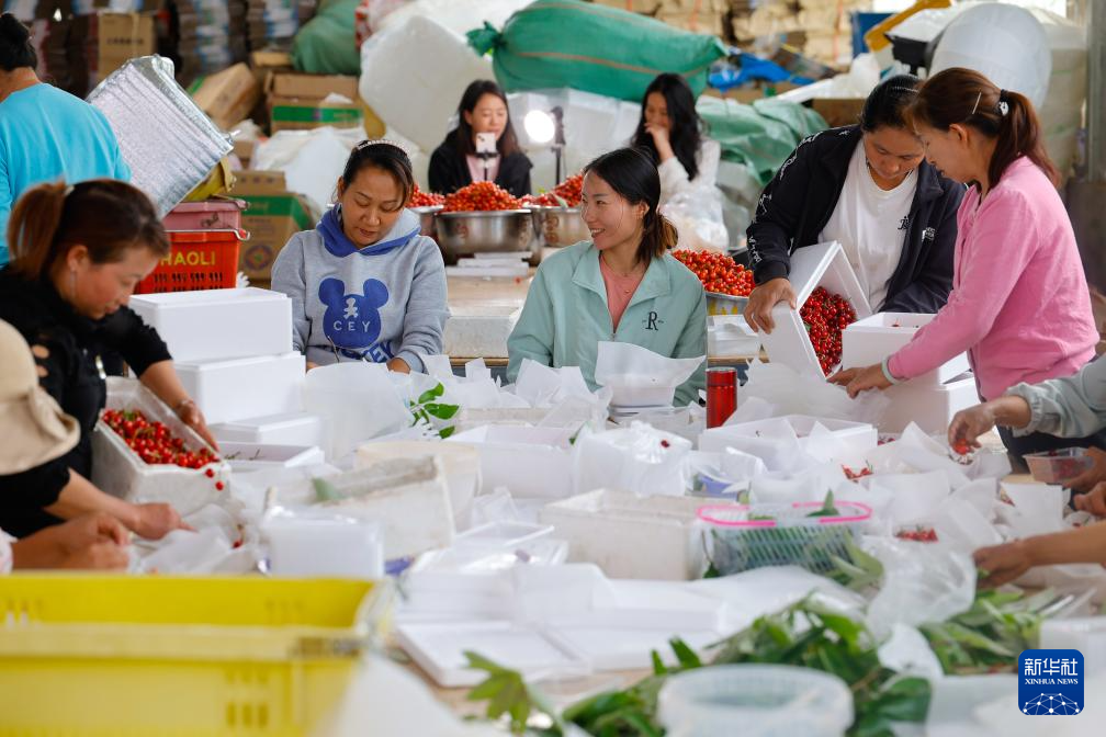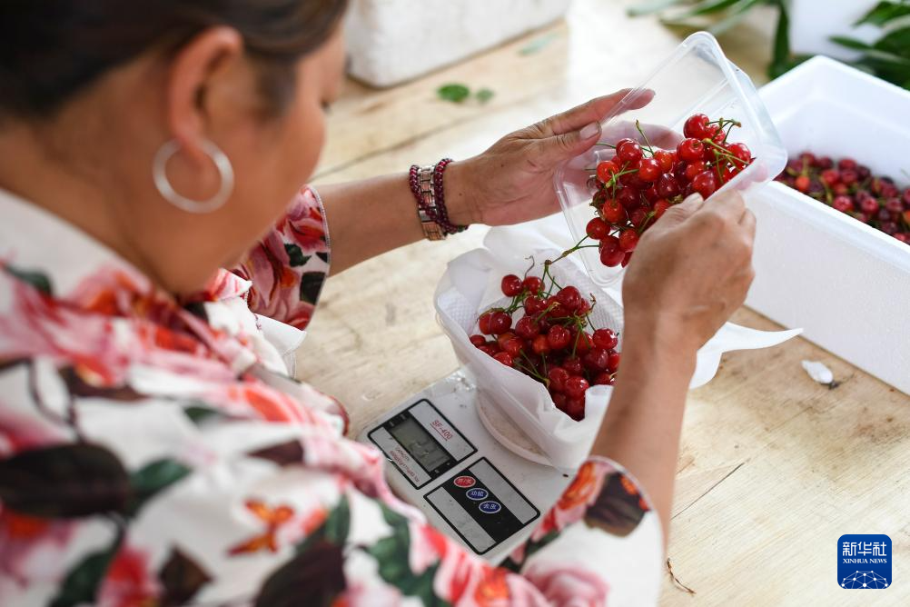 4月9日,工人在米易县普威林产品分拣中心分拣、称重樱桃。