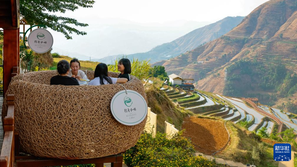4月9日,在米易县新山傈僳族乡梯田附近的稻香咖啡,游客们一边品尝咖啡等饮品,一边欣赏美景。
