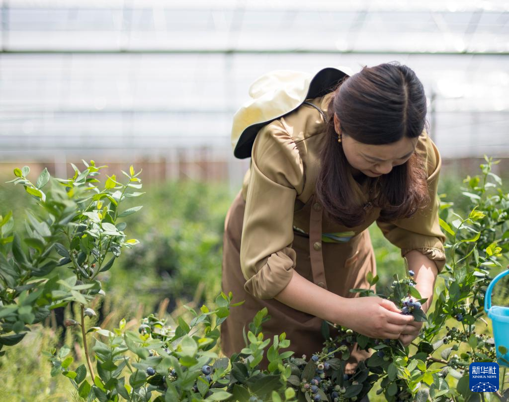 4月9日,蓝莓种植户付利在米易县普威镇一个蓝莓种植基地内采摘蓝莓。