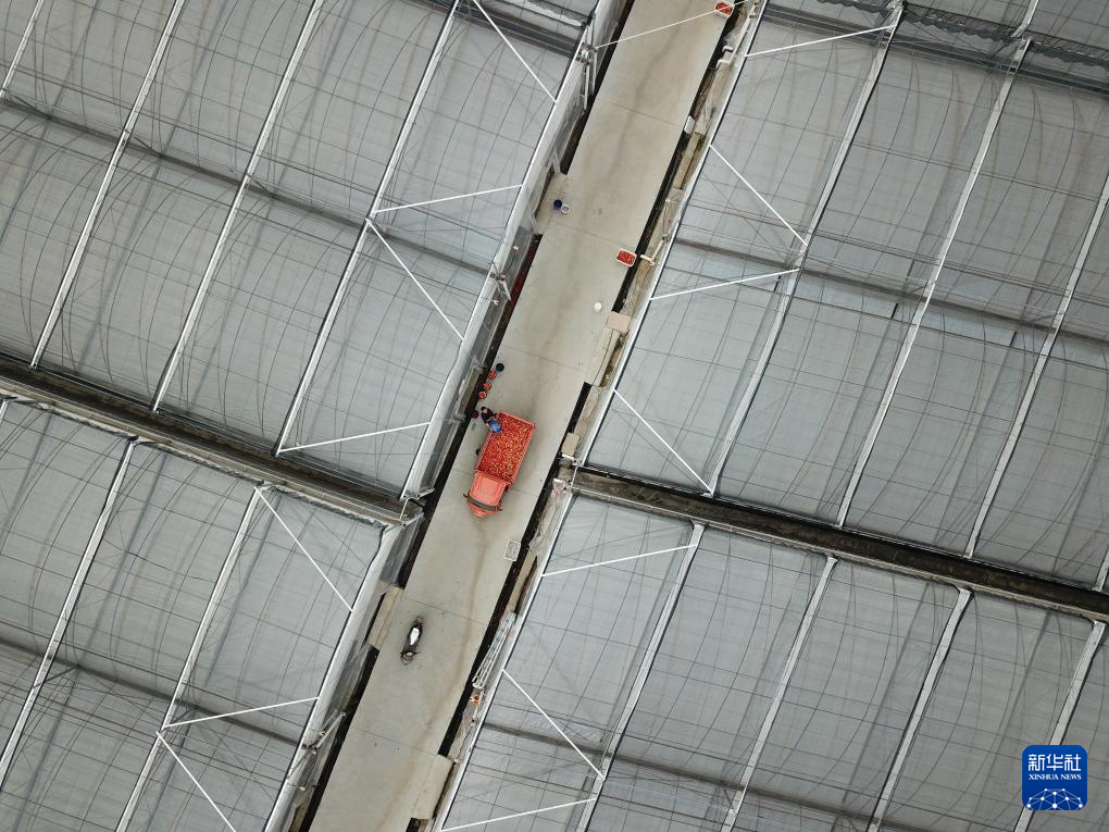 4月8日,在米易县丙谷镇共富农场,工人将刚采收的番茄装车(无人机照片)。