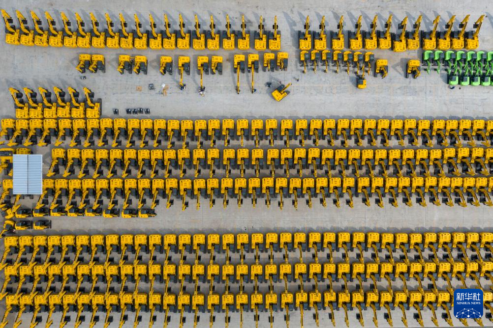 这是停放在太重集团智能高端液压挖掘机产业园区内等候交付的液压挖掘机产品(4月9日摄,无人机照片)。