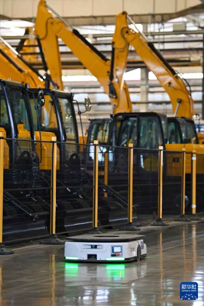 自动导引车在太重集团智能高端液压挖掘机产业园区内的智能生产线上作业(4月9日摄)。