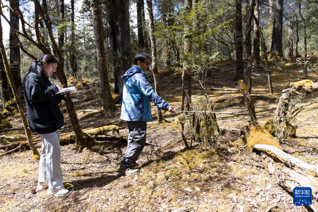 丽江高山植物园工程师范中玉(右)在云杉坪大样地内采集数据(3月28日摄)。