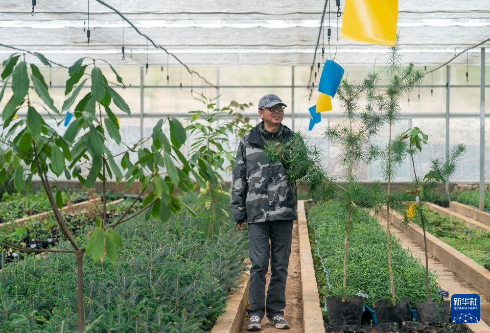 许琨在丽江高山植物园一处温室内查看植物生长情况(3月27日摄)。