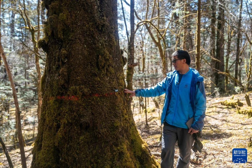 丽江高山植物园工程师范中玉在云杉坪大样地内查看一棵杉树(3月28日摄)。