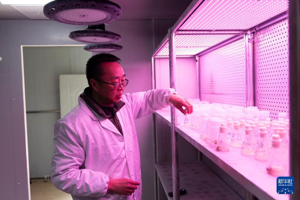 许琨在丽江高山植物园野外台站组培室内查看正在进行萌发实验的黄花杓兰(3月27日摄)。