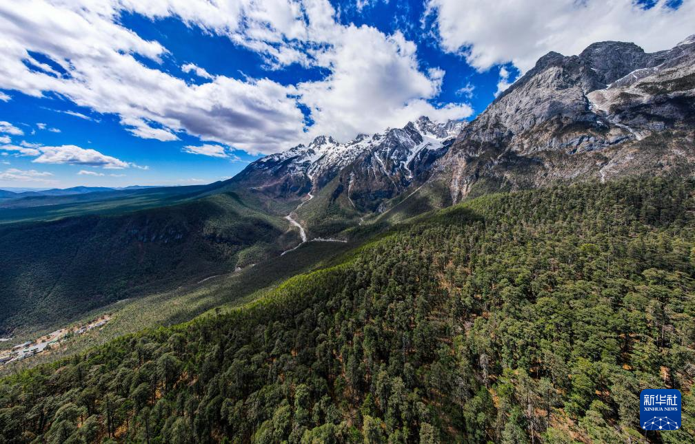 这是3月28日拍摄的丽江高山植物园云杉坪大样地,远处是玉龙雪山(无人机照片)。