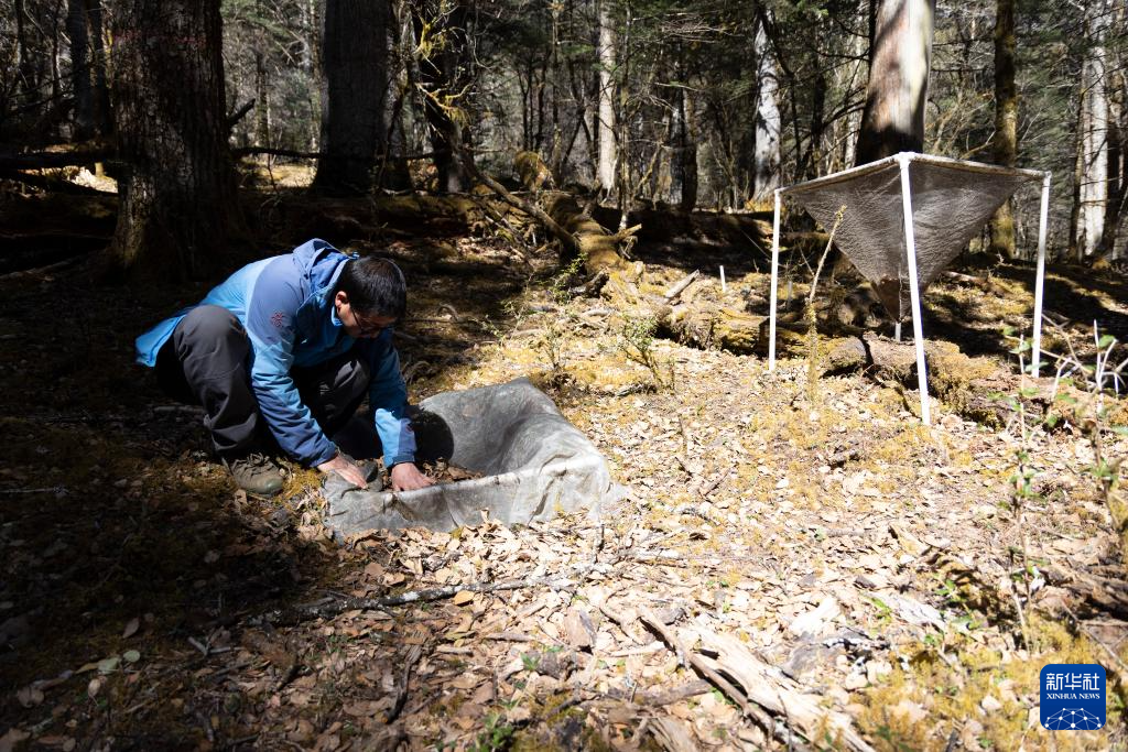 丽江高山植物园工程师范中玉在云杉坪大样地内查看一个种子雨框,种子雨框主要用来收集树上落下来的种子(3月28日摄)。