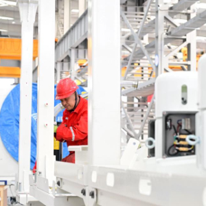 4月10日,工人在隆化县金风电控设备有限公司风电车间装配机舱。