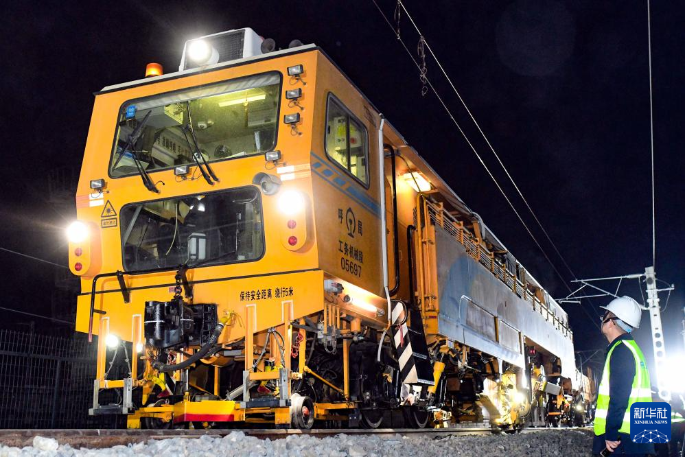 4月10日,施工机械在包西上行铁路封锁拨接施工现场作业。
