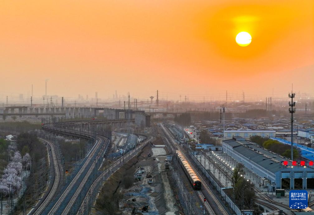 4月9日傍晚拍摄的包银高铁包头枢纽京包客专上行、包西上行铁路双线封锁拨接施工现场(无人机照片)。