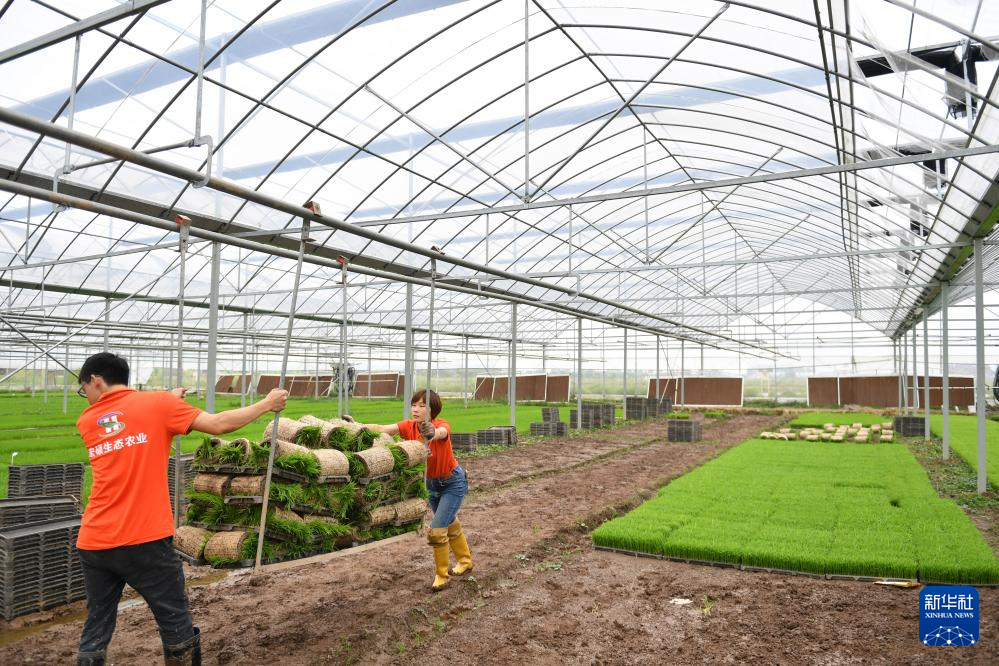 4月10日,大通湖区宏硕生态农业农机合作社工作人员在搬运秧苗。