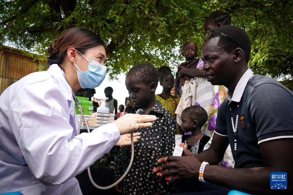 4月10日,在南苏丹首都朱巴西南的纳基图恩村,中国医疗队医生为村民义诊。