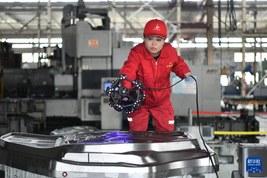 4月10日,泊头市金键模具有限责任公司技术人员在利用蓝光扫描仪检测汽车模具产品质量。
