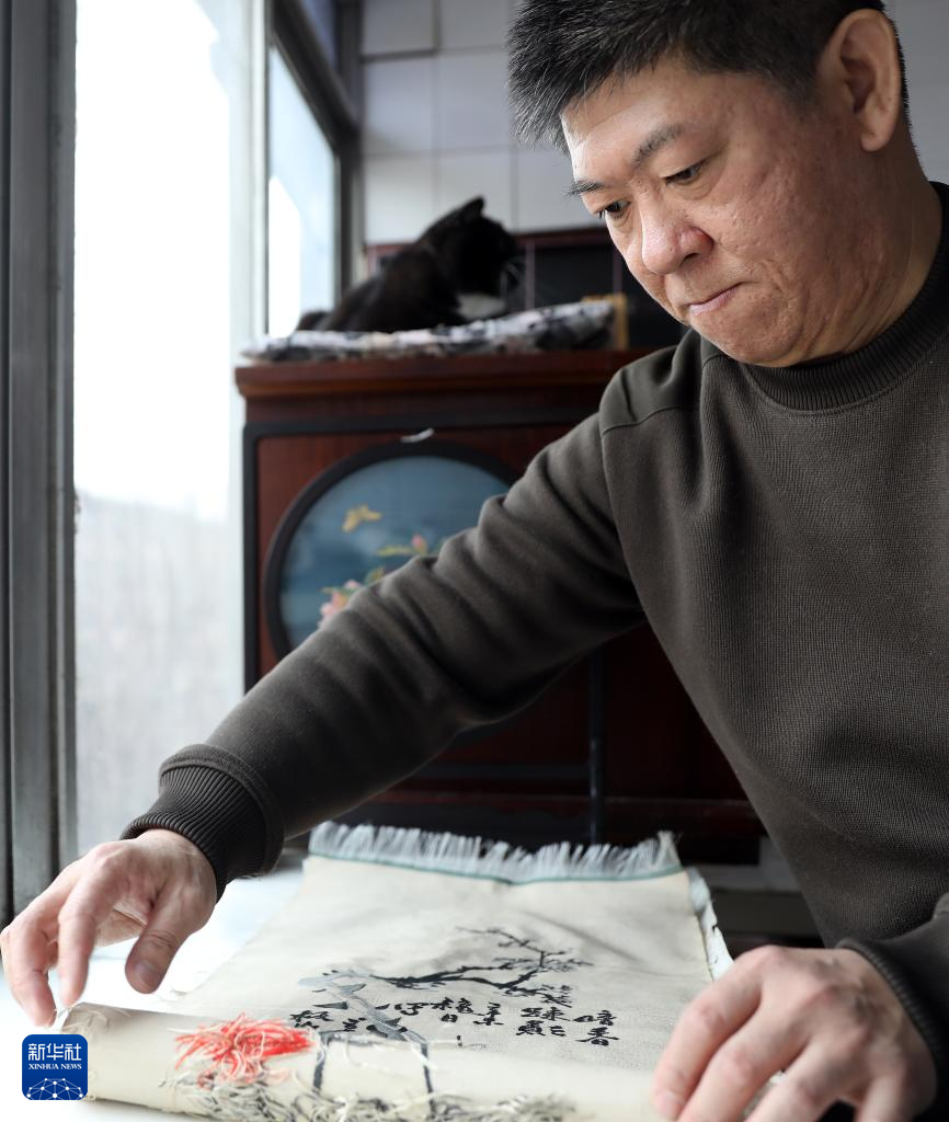 4月9日,申涛在位于营口市的家中卷起一幅未修剪毛头的缂丝半成品。
