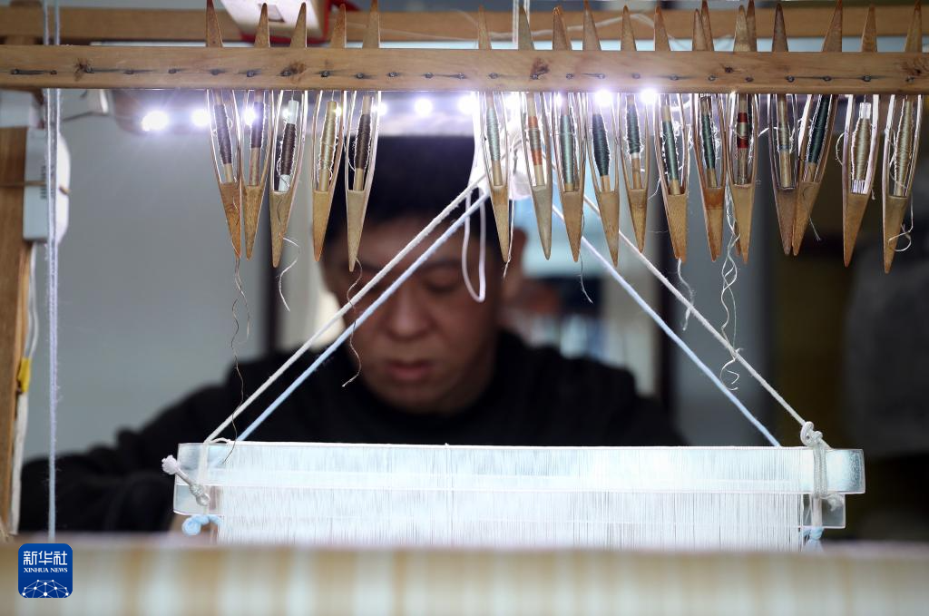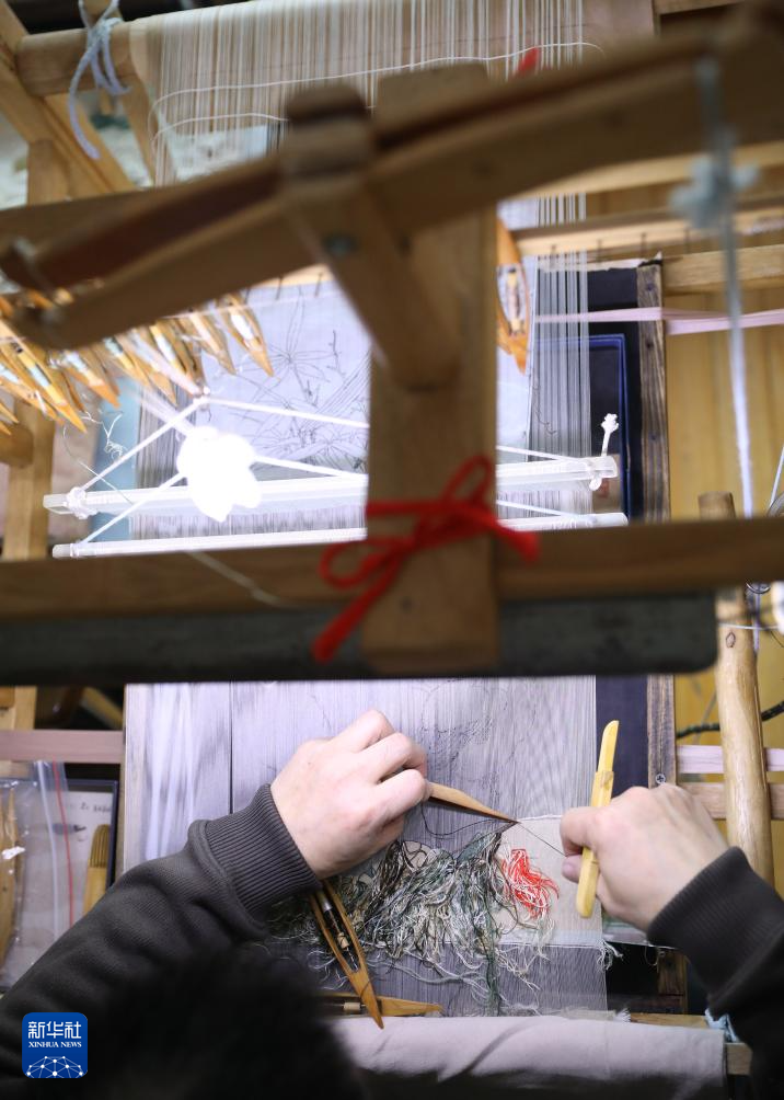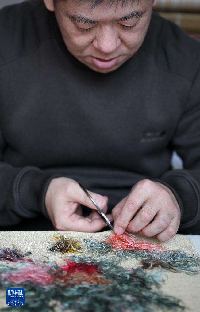 4月9日,在位于营口市的家中,申涛左手拿着缠着丝线的梭子,右手拿着梳理丝线的拨子进行缂丝作品创作。