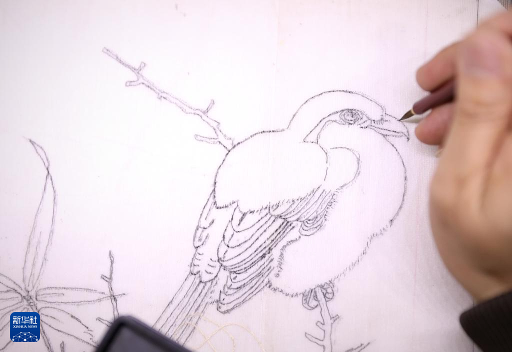 4月9日,申涛在家中的缂丝机的经面上描绘画稿。