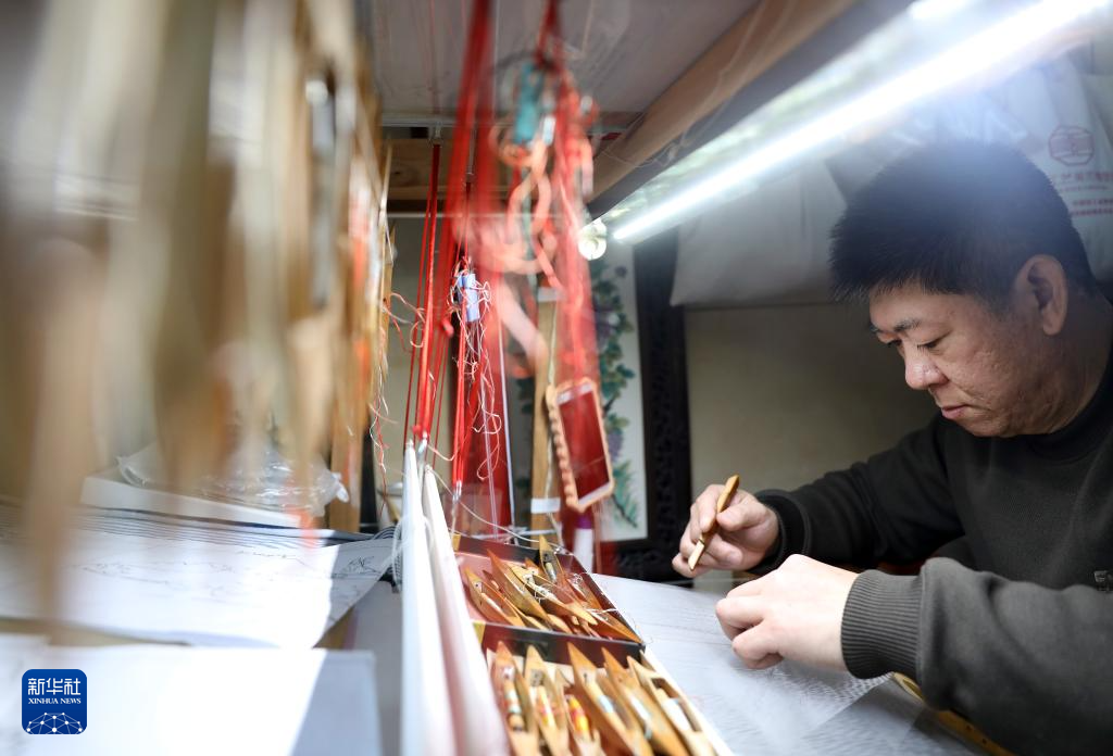 4月9日,申涛在位于营口市的家中进行缂丝作品创作,一排梭子挂在缂丝机上。