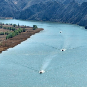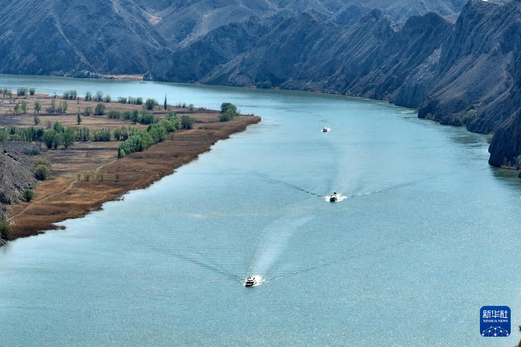 4月10日,游客乘船在位于宁夏青铜峡境内的黄河大峡谷观赏游玩(无人机照片)。