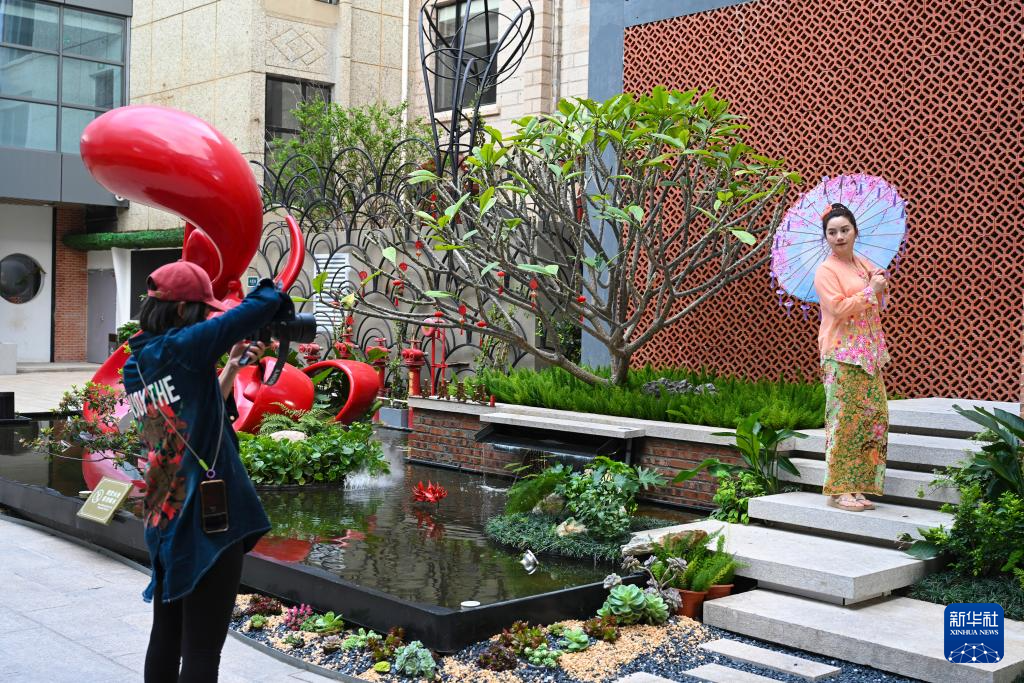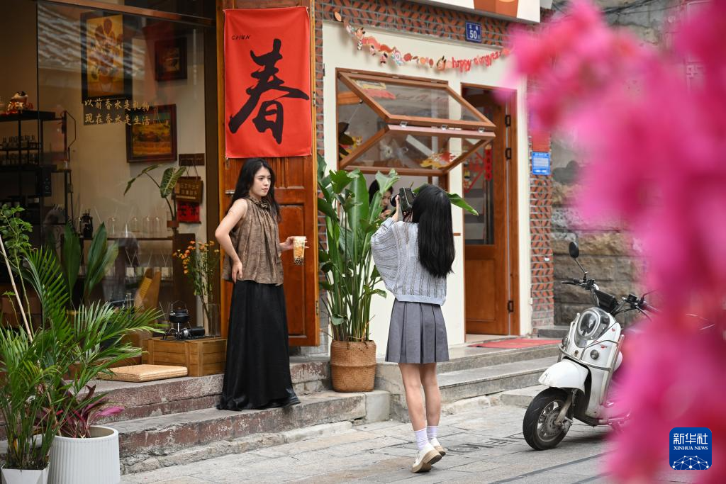 4月10日,游客在泉州中山路的一家香氛用品店前打卡、拍照。