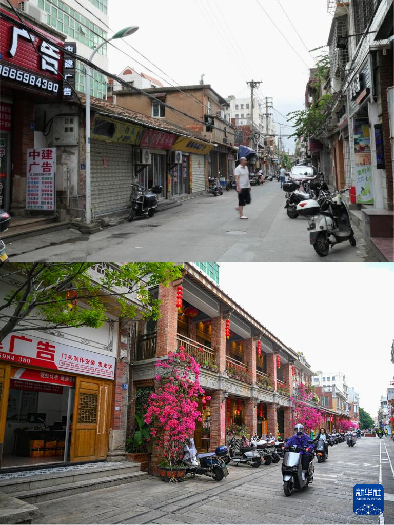 拼版照片:上图为中山路传统商业区改造前的街景(资料照片);下图为同一地点改造后的街景(4月10日摄)。