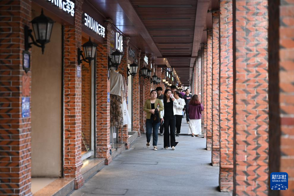 4月10日,游客在泉州中山路连排式骑楼下的廊道内逛街。